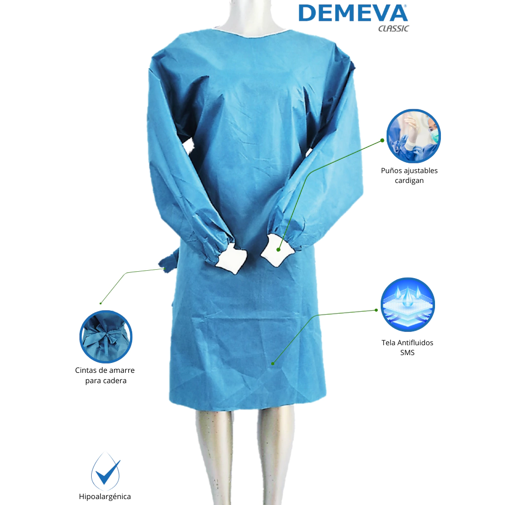 La bata tipo quirúrgica sin refuerzo DEMEVA está fabricada con tela no tejida (SMS) 100% polipropileno de grado médico, con un gramaje de 30 a 35 g/m², dependiendo del color. Este insumo proporciona una barrera segura contra fluidos y partículas, especialmente en procedimientos clínicos y quirúrgicos que requieren altos estándares de higiene y control de infecciones.